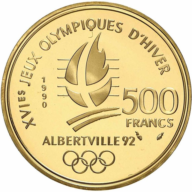 | 図案(裏) | 「XVIes JEUX OLYMPIQUES D’HIVER」「ALBERTVILLE 92」「500 FRANCS」など |
