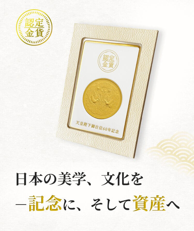 こちらは天皇陛下御在位60年記念10万円金貨を封入した認定金貨です。純金20gであることから金相場に連動した価格で取引できます。